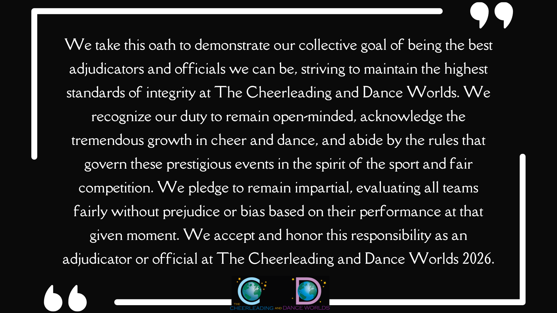 The Cheerleading Worlds judges are often those nominated by member Event Producers who send bid-winning teams to Worlds and/or are judges in good standing who have previously judged the Worlds event. Applicants must confirm their ability to sit on the judging panel based upon established criteria and must undergo an approved background check, complete athlete abuse prevention education, and sign a statement of confidentiality and ethical behavior as a person serving in any Worlds judging capacity. A Judge Selection Committee comprised of Worlds officials, Event Producers and industry experts, looks for well-rounded judging panels that include diversity, geographic locations, judging backgrounds and expertise and other criteria/qualifications. Upon review of each prospective judge’s application, committee members rate and review each applicant with their qualifications to adjudicate the Worlds event. Upon selection, judges undergo virtual and onsite training and once at the event will take an oath to remain impartial, evaluating all teams fairly without prejudice or bias based on their performance at Worlds.